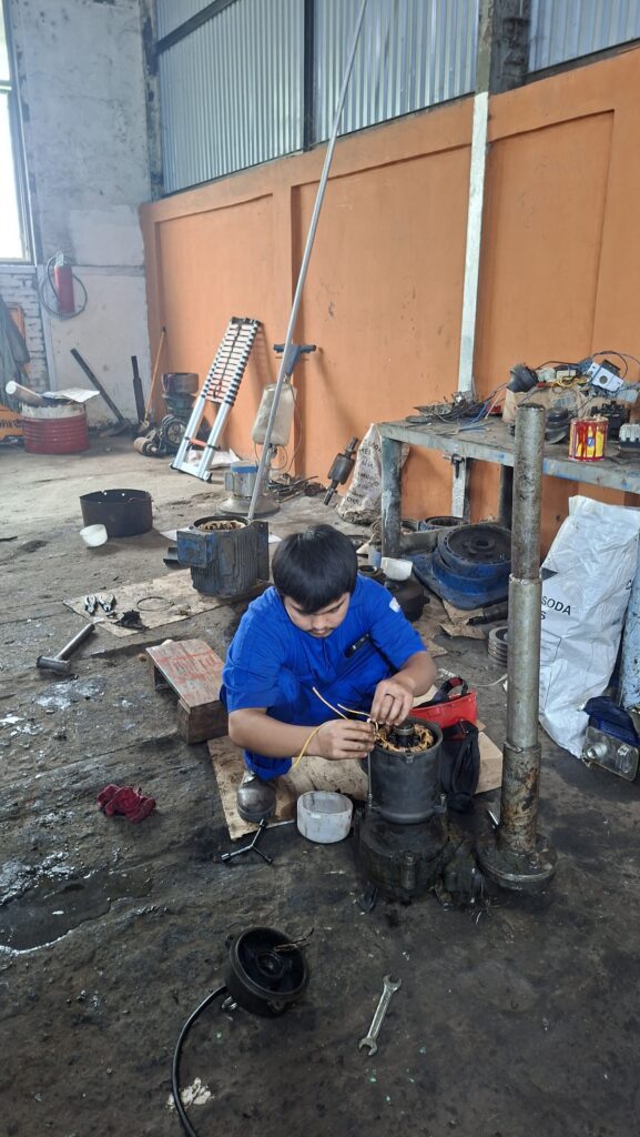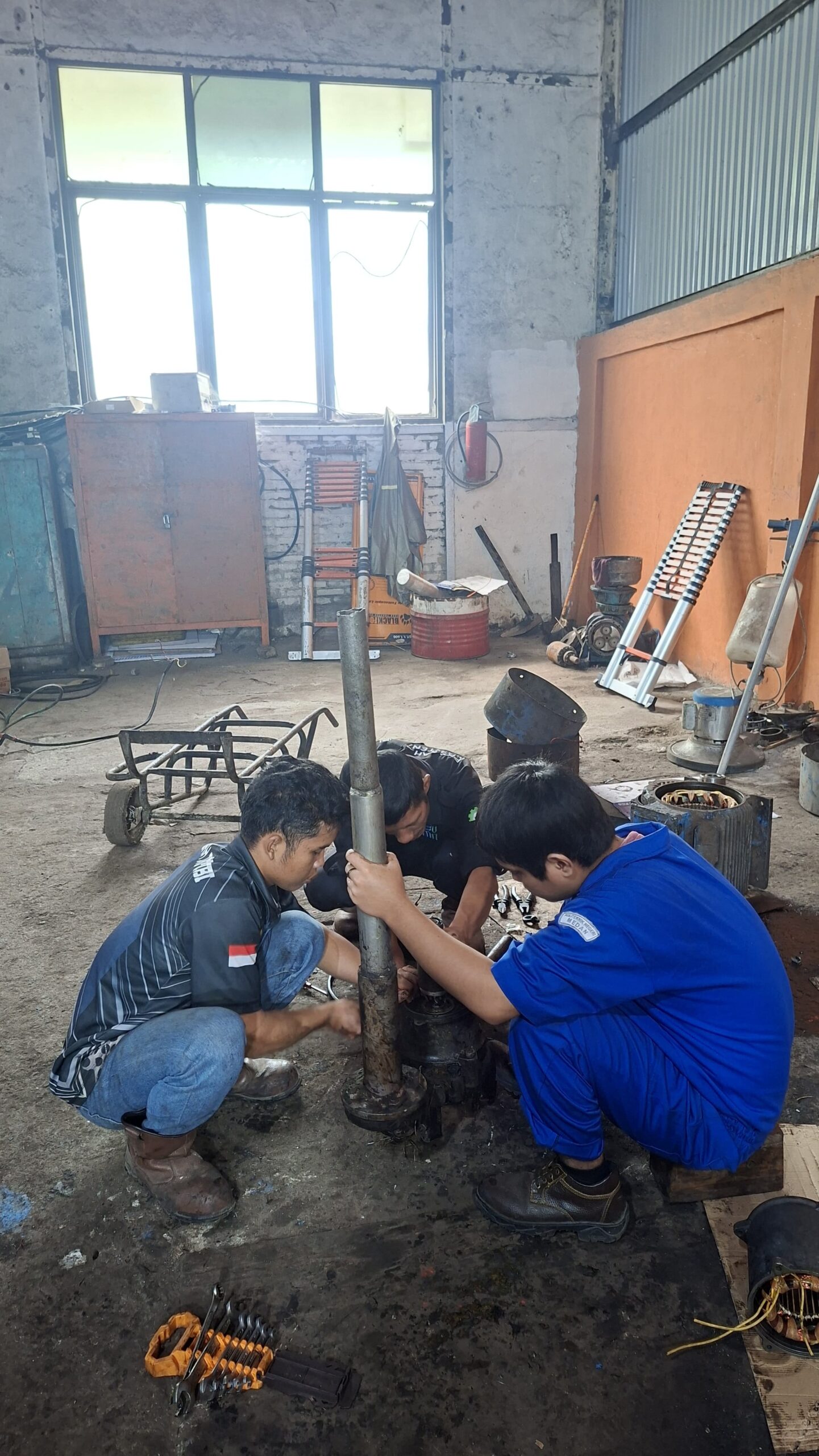 Proses memperbaiki pompa air yang terbakar akibat tersumbat sampah limbah