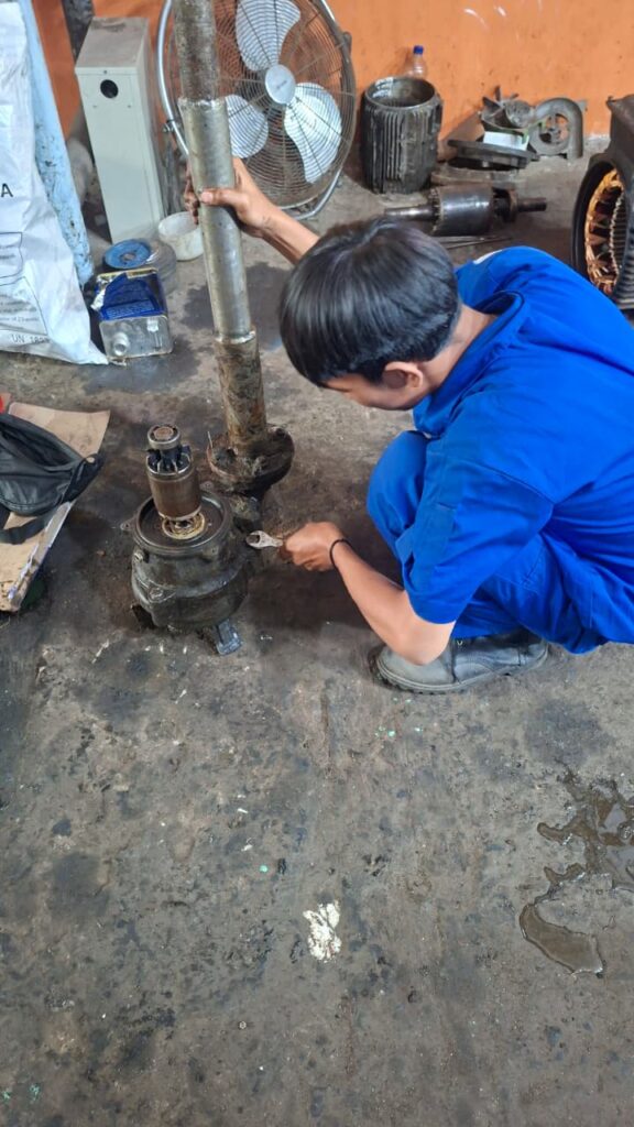 Proses memperbaiki pompa air yang terbakar akibat tersumbat sampah limbah